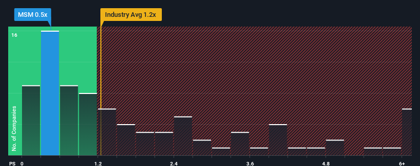 当马来西亚食品行业近一半的公司的市销率(或“P/S”)高于 1.2 倍时,您可以考虑 MSM 马来西亚控股有限公司 (吉隆坡证券交易所:MSM)作为一项有吸引力的投资,其市盈率为 0.5 倍。 然而,P/S 较低可能是有原因的,需要进一步调查以确定其是否合理。